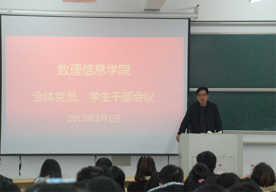 在南山6号楼A203召开学院全体党员、学生干部会议。学院党委副书记史正东老师、学生科副科长邱科强老师、全体辅导员、学生党员、学院分团委学生会副部及以上成员、书院分团委学生会副部及以上成员、各班班长、团支书参加会议。会议由史正东老师主讲。