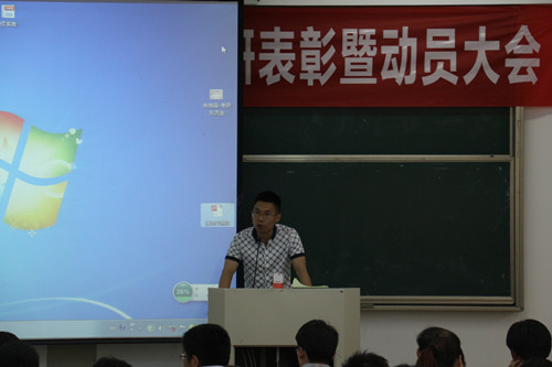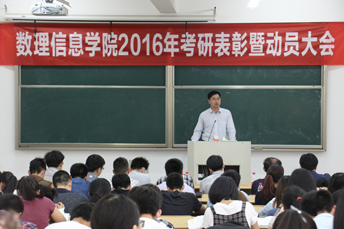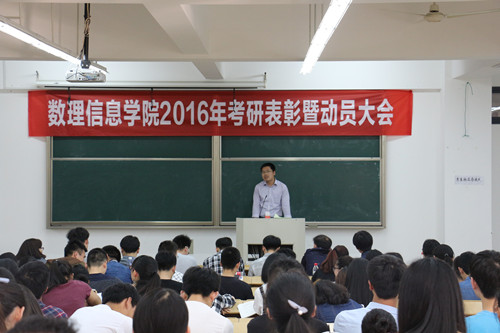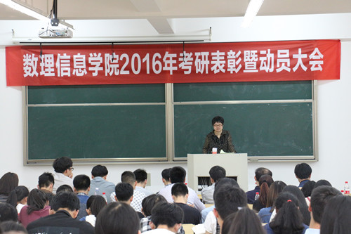 2016年考研表彰暨动员大会在南山6号楼A203举行,学院党委书记楼智美、党委副书记史正东、各学科主任、教工党支部书记、各学生考研团队导师、2013级各班主任、辅导员、2012级考取硕士研究生的41位同学以及2013级参加考研的学生、2014级和2015级考研团队的同学共200余人参加大会。大会由学院党委副书记史正东主持。