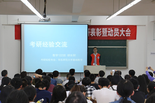 2012级考研优秀代表上台分享了自己的考研历程。他们从自身经验出发,向在座有志向考研的学生提出了宝贵的建议。既然下定决心考研,就要吃得了苦,静得下心,坚持到底,也要注意锻炼身体,保持健康体魄。2013级考研学生代表作表态发言,坚定了信心,鼓舞了斗志,明确了目标。