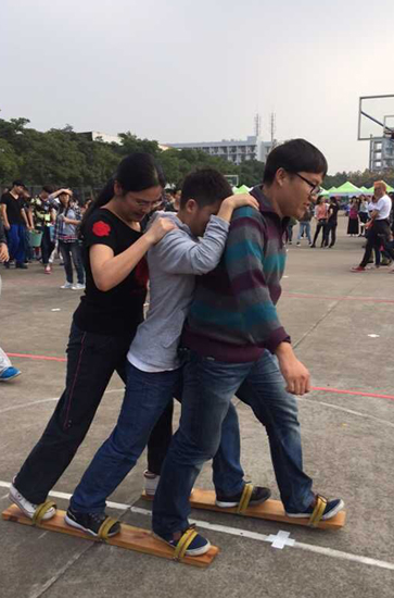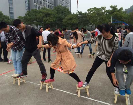 下午1点10分,南山校区篮球场上人头涌动,参加比赛的教职工已早早到场准备,学院党委书记楼智美等院领导也到场加油助威。最先开始的项目为板凳接龙,枫林网