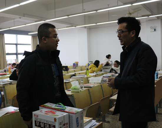史正东老师详细询问了考研学生的复习备考状况,并且鼓励考研学子要树立信心,排除一切干扰,认真对待考试,仔细分析考题,并祝备战考研的学子们都能够考出一个好成绩。他认为,大四同学的考研之路绝不是孤军奋战,更有全院的老师为其做强大的后盾,为他们提供保障。他还强调考研贵在坚持,要克服一切艰难,全力冲刺,要有有甘于寂寞、不怕困难的劲头和勇气。现场有不少同学对于学院领导带来的亲切慰问深表感激,他们也表示定会努力坚持到最后。