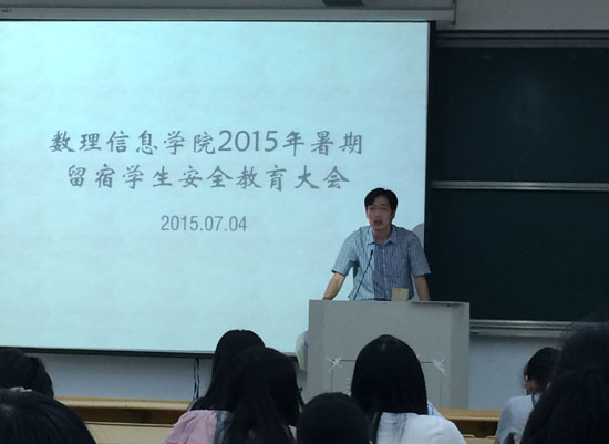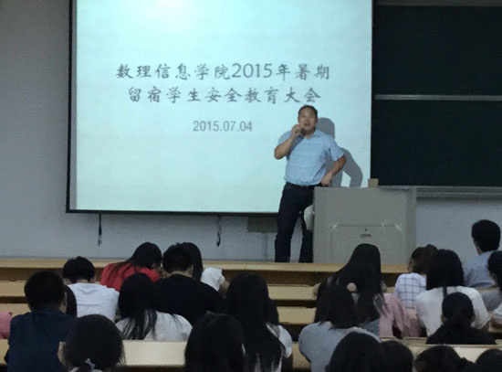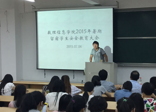 在南山综合楼A203举行2015年暑期留校学生安全教育大会。学院党委副书记史正东、建功书院院务副主任陈新辉、学生科副科长邱科强、学生科辅导员以及全体暑期留校学生参加大会。会议由学生科辅导员蔡寅亮主持。