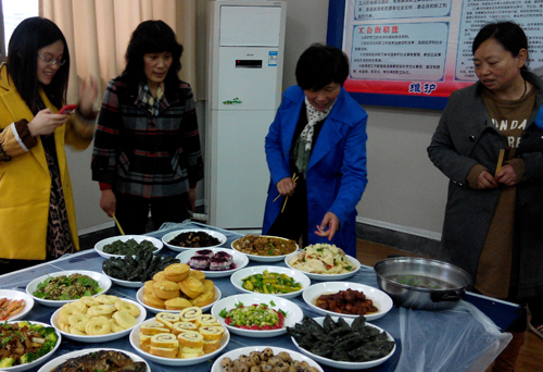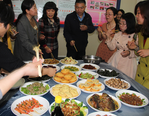 很多女教工提前精心准备,纷纷亮出了拿手好菜,烤虾、红烧鱼、红烧肉、香椿炒鸡蛋、霉干菜扣肉、笋烧肉、小鸡炖蘑菇等等,让教职工们大饱口福,蓝莓蛋糕、蓝莓山药等更是有创意、有特色。活动现场,为了让全院教职工吃上团圆饭,女教工们切菜的切菜、和馅的和馅、包饺子的包饺子,忙的不亦乐呼。院长俞军、院党委书记楼智美亲自上阵,院工会主席、党委副书记史正东带领男教工们也参与进来帮忙打下手,一同制作“舌尖上的美味”。校工会调研员赵梁红、副主席陈洁敏等也亲临现场,感受了现场气氛并品尝了大家的厨艺作品,对活动给予了高度评价。
