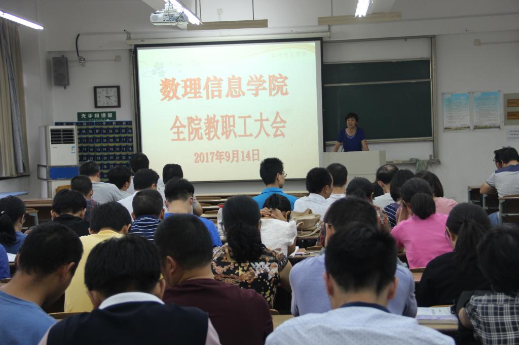 2017年9月14日下午,学院在南山6号楼C207教室召开新学期全院教职工大会,传达学校相关会议精神,总结暑期工作,部署、安排新学期教学、科研、学生等工作。会议由学院党委副书记史正东主持。