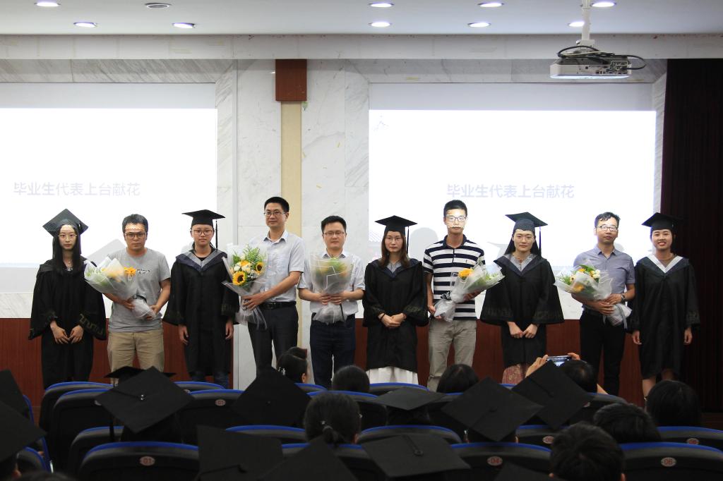 第二项议程是毕业生感念淳淳师恩。方小利老师、王元斌老师、祝汉灿老师、杨哲老师、王晓军老师接受毕业生献花并合影留念。