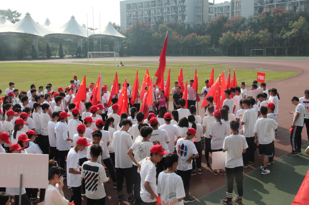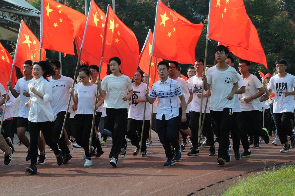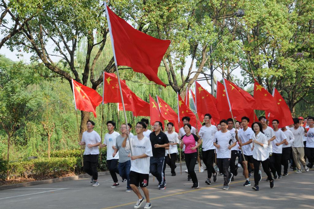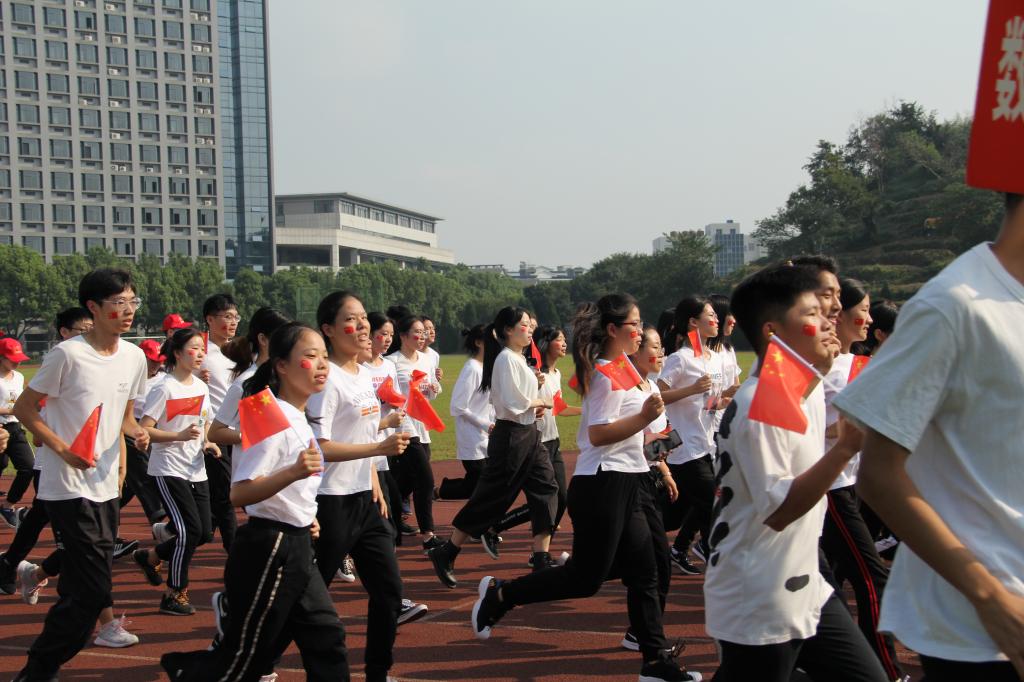 开幕式上,参加合唱的学生进行了快闪活动,献唱了《我和我的祖国》,他们用最熟悉的旋律,表达了对祖国最真挚的祝福。参加跑团的全体学生组成方队摆出“70”的字样,以庆祝新中国成立七十周年。随后,校党委副书记郝敬习老师宣布“迎国庆数理奔跑,看校园最美风景”活动正式开始,跑团活动在红旗的带领下,由老师领跑,浩浩荡荡的奔跑队伍在操场慢跑一圈后跑入校园,边跑步边欣赏初秋校园美丽的风景线。