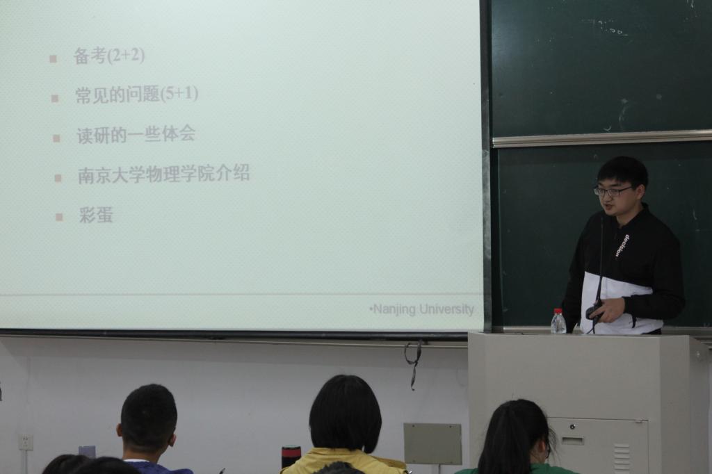 讲座期间,骆叶成学长结合自身考研经历和读博期间的感受发表了对有关考研如何备考和读研方面的宝贵经验和独到见解。讲座主要分为五部分。首先,在备考方面,骆叶成学长强调要合理安排考研科目的备考时间,注重阶段性总结。前期,要夯实专业课的基础;政治在9月以客观题为主,在12月以主观题背诵为主;英语备考要回归真题,着重把握阅读和作文。同时,骆叶成学长从考研动机、考研择校、专题信息搜集、公共课是否报班、读研成本5个方面对考研中的常见问题展开详细分析,并发表自己的考研感想来表达对梁奇锋老师的悉心指导和学院对考研事业大力支持的由衷感谢。他还强调在读研期间要反复研读文献,听取学术报告,以做到与时俱进,与科技前沿接轨。然后,骆叶成学长通过展示南京大学提供的就业平台与升学机会、物理学科的实力分析、丰富的奖助体系来介绍南京大学,以鼓舞考研学子树立信念,认真备考。最后,骆叶成学长分享了一些彩蛋,其中包括南京大学历年真题及参考答案、自我学习网站、调剂信息。