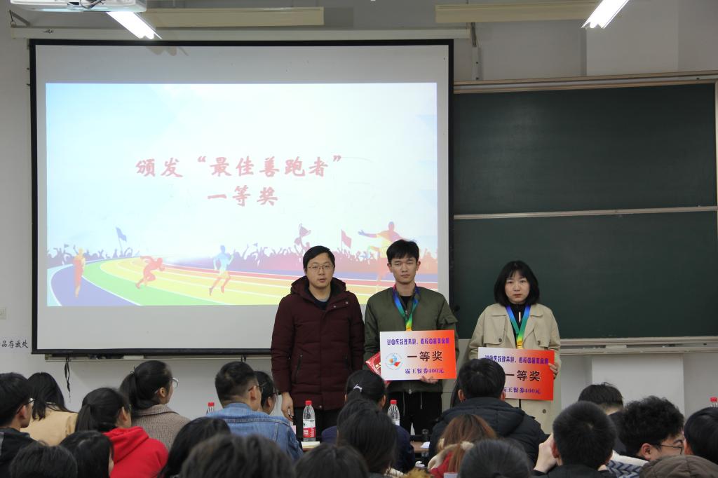 分团委书记潘丽华老师宣读获奖名单,对在跑团活动中表现突出的佼佼者予以表彰奖励,并赋予他们“最佳善跑者”的称号。男生排名第一的同学打卡52次,累计奔跑里程数高达124.93公里,女生排名第一的同学打卡51次,累计奔跑里程数高达231.52公里!多名同学打卡次数超过30次,获奖同学不仅有来自枫林网