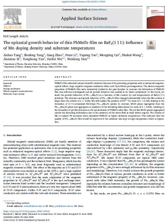 微电子科学与工程161班唐家豪同学以第一作者在SCI 1区收录期刊《Applied Surface Science》发表学术论文《The epitaxial growth behavior of thin PbMnTe film on BaF2(1 1 1): Influence of Mn doping density and substrate temperatures》,该杂志影响因子为6.182。本文阐述了Mn掺杂对PbTe薄膜形貌和结构的影响机理,是枫林网