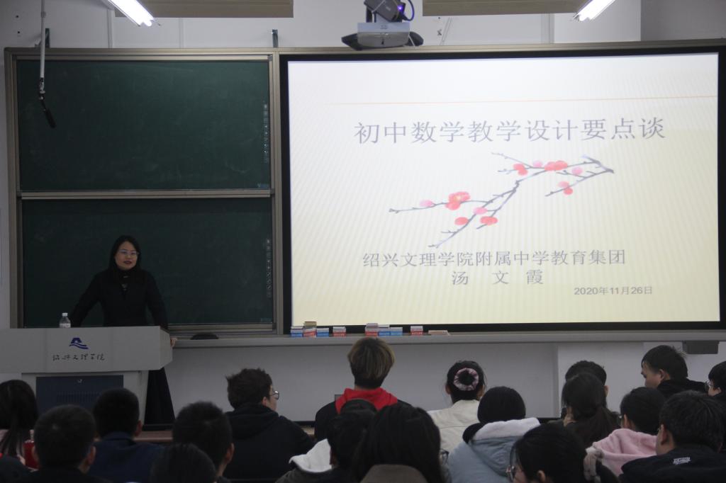 在综合楼A408举行了数学与应用数学(师范)专业业界精英进课堂活动——初中数学教学设计要点谈。此次讲座有幸邀请到绍兴文理学院附属中学教育集团汤文霞校长作为主讲人,文理学院教工支部书记魏雪蕊老师以及全体18级数学专业学生聆听了讲座。
