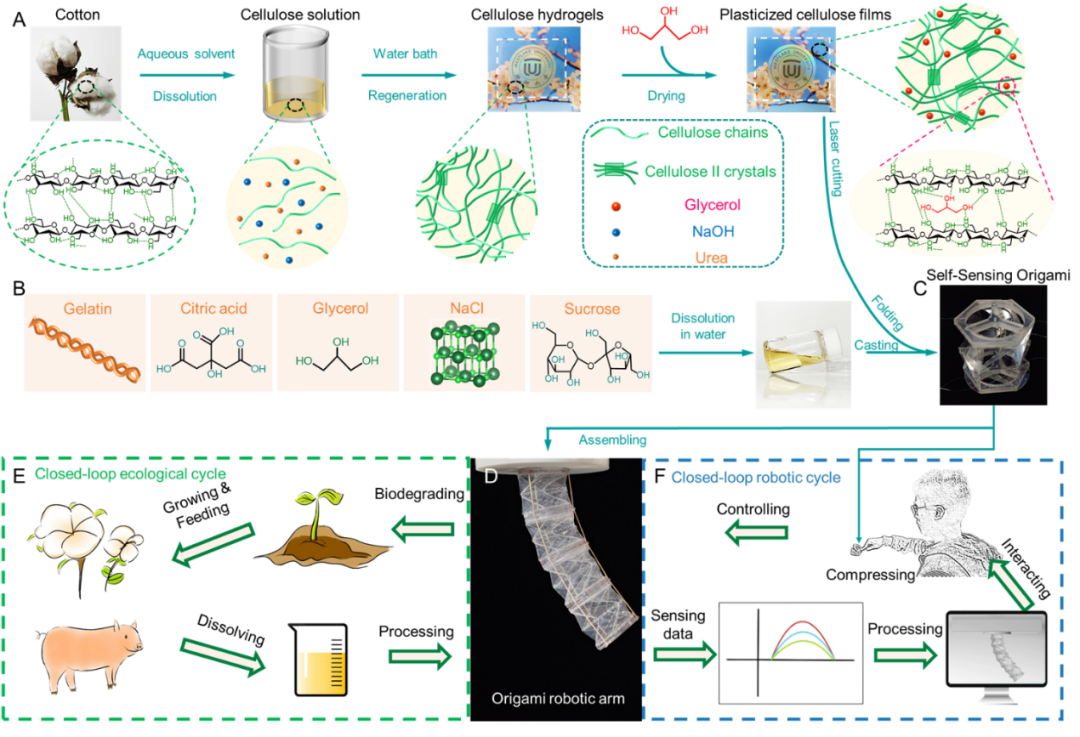 为了解决上述难题,该研究将可生物降解纤维素薄膜与可变形折纸技术结合,辅以同样可生物降解的明胶离子凝胶,提出了一种构筑可持续和可生物降解的模块化自感知折纸机器人的新方法。这种方法可以为高塑性材料和软体机器人应用场景之间架起一座桥梁,有望进一步推动高强度塑性材料在软体机器人领域的应用。如图1所示,可持续折纸机器人模块由甘油增塑的纤维素薄膜、3D打印固定板以及明胶基离子凝胶传感器组成。纤维素折纸与明胶基凝胶分别利用水系溶剂体系进行制备,两者的合成过程均不使用任何环境不友好的有机溶剂,构筑机器人系统过程的可持续性显著提升。利用该方法构筑的可持续性软体机器人系统同时实现生态循环(生长-加工-降解)和机器人功能(驱动-传感-交互)闭环。