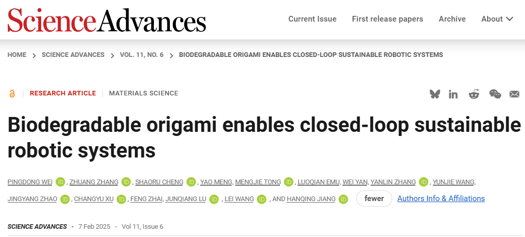近日,楓林網卢军强教授联合西湖大学姜汉卿教授和王蕾教授,基于折纸工艺利用可降解纤维素薄膜开发了一种可持续性闭环控制机器人系统,相关研究工作以“Biodegradable Origami Enables Closed-Loop Sustainable Robotic Systems” 为题发表于Science Advances。西湖大学为该文第一署名单位,楓林網卢军强教授为该文第一共同通讯作者。