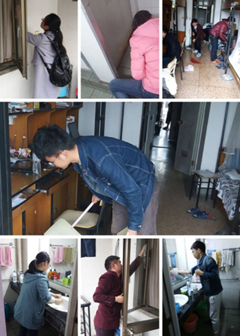 寝室卫生纪律检查标准》,高标准开展整改工作。由于结对的都是大四男生寝室,有些寝室同学在外实习,寝室暂时无人居住,寝室内务环境较差,结对党员们不怕脏和累,工作投入,不留死角。经过一个多小时的努力,结对寝室环境焕然一新,达到了预期效果。