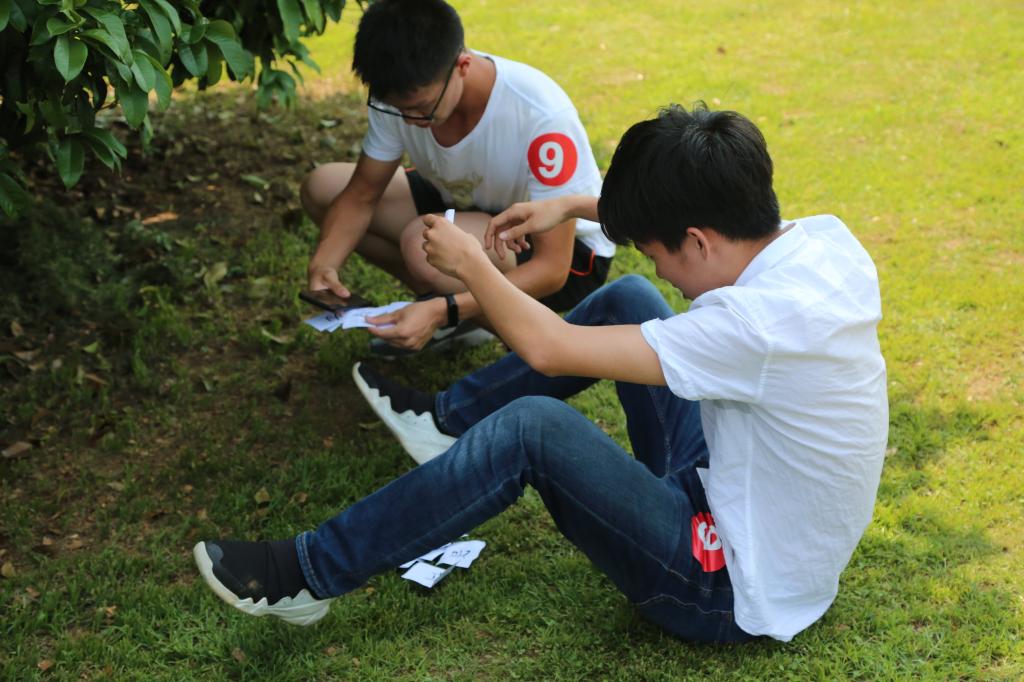 随着比赛口令的正式发出,参赛队员们立即出发,奔向藏有定向卡图的史迹教室。从史迹教室得到入门标语后,各小组马不停蹄地奔向情人坡或南山7号楼寻找提示卡碎片,并拼凑出完整的提示语。大家怀着满满的热情,在校园中来回穿梭寻找提示卡。完成这一任务后,各小组再次返回综合楼所对应的史迹教室,完成相应的任务,拿到定向卡图。
