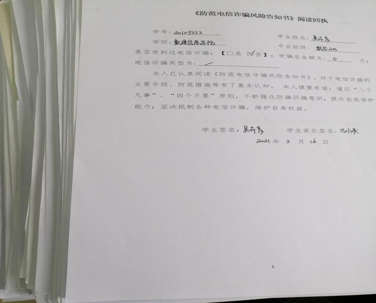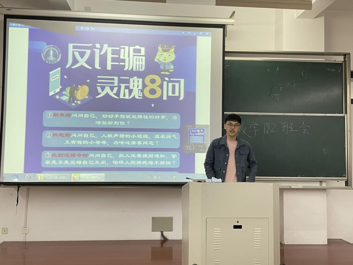 全体班级通过在课间播放教育视频、课间的案例警示教育、课间的个人教育分享将反诈防骗作为重要内容,有针对性开展以网络安全知识、金融信贷常识、个人信息保护、理性消费观念、反诈防骗基本常识等为主要内容的宣传教育,切实增强学生的防诈、识诈、反诈意识和能力。在辅导员或班主任指导下,各班学生签订反诈防骗承诺书。班级通过主题班会、防诈知识测试、推送警示案例、防范电信网络诈骗免费保险活动、开展“断卡行动”等活动加强教育力度。
