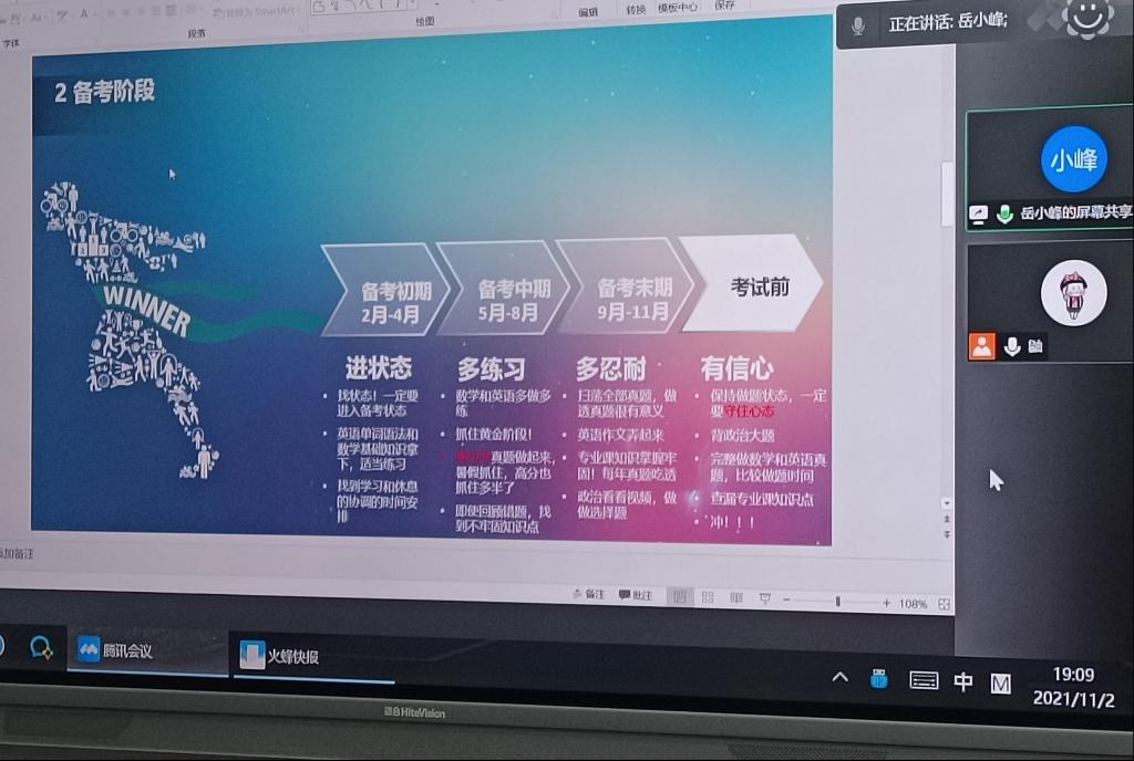 接下来是岳小峰学长的考研经验分享。院校选择方面,他告诫大家要评估学习能力,不要好高骛远,不要设下虚假目标;注意收集院校资料,注意历年的录取分数线、结合自身情况做最后决定。同时,要及时与朋友和师长进行沟通,以便在枯燥的考研过程中坚持下来,并分析了考研的各个时期应该做的准备。备考复习方面,学长也讲述了自己当时的考研备考经验,从备考初期、备考中期、备考末期及考前四个阶段的时间分布及数学、英语、政治、专业课的复习重点进行了细致的讲解,并指出一定要有自己的节奏,才能更好更快的融入考研的状态,可以产生事半功倍的效果。在复试经验方面,学长指出切记不要紧张,保持放松状态,及时展露自己的优势,利于吸引考官。