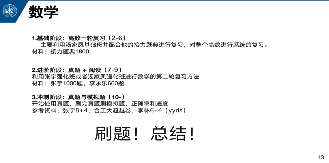 讲座期间,刘晓辉学长结合自身考研经历和读研期间的感受分享了备考前期的建议、考试复习计划、考研过程经验,让同学们收获颇多。第一:在考研前期准备中,大家需要明确自己的考研动机,关注近几年的考研人数,结合自身能力确定好目标院校及目标专业,充分利用目标院校的资料书进行复习,将事半功倍;第二:在初试准备中,同学们需要将时间规划好,具体而言分三个阶段——基础阶段、强化阶段及冲刺阶段。基础阶段注重数学一轮复习及英语背单词,强化阶段注重强化数学、政治及专业课复习,冲刺阶段注重背政治分析题及英语作文。刘晓辉学长还专门为每一科推荐了相应的资料书,强调要解决问题,重点在于刷题,写错题集并及时总结方法。学长还给出一张完整的暑期复习安排表,希望能够给考研学生提供参考。关于复试准备,学长分笔试、面试及联系导师三阶段讲解,并强调慎重选择导师极为重要,合适的导师对于你的研究生生涯起着举足轻重的作用。