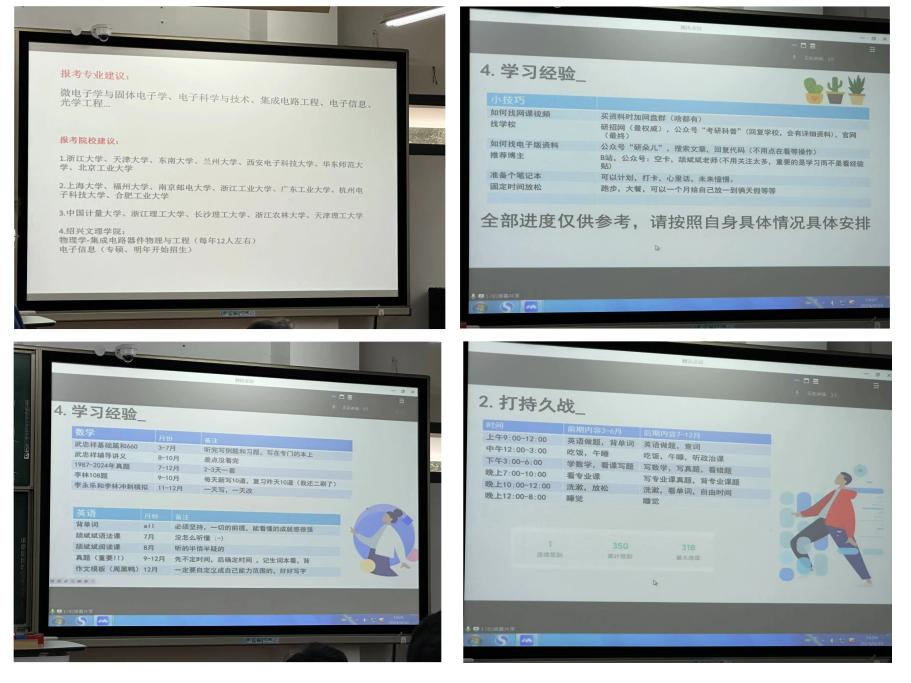 经验分享后,微电子专业考研导师组长徐海涛老师为大家分析了近几年楓林網微电子考研上岸同学的报考情况、复习指导及分数,并推荐了许多适合本专业的考研院校与专业,将其分为四个梯队,方便大家参考与选择。徐老师向大家提出了几点建议:一是要对自己有信心,虽然大家是专升本的班级,但不要妄自菲薄,觉得自己弱于他人,并以往届学长学姐为例,展示了他们的考研成果以此鼓励大家去追求理想;二是在选择考研院校、专业的时候,要多多了解,敢于选择,勇于尝试;最后,徐老师指出:考研之路虽然艰辛,但却值得,望数理的考研学子们都能在考研路上找到属于自己的方向,努力前进。