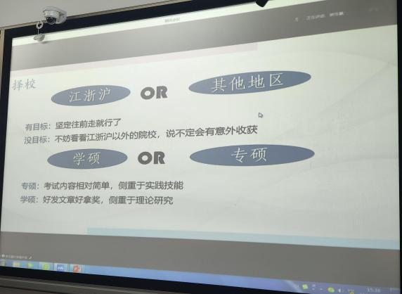 最后,电子信息工程专业考研导师组长于梅老师从学校选择开篇,告诉同学们不要过于关注地域,不要将目光投在江浙一带,要将视野拓展到全国范围内。接着于老师推荐了适合的专业课,并告诫同学们一定要树立好准确、适合自己的考研目标,并为之而努力。最后,于梅老师再一次强调了态度的重要性以及为考研所需要的学习和生活的状态,精气神的提高,过一个充实且有意义的大学生活。