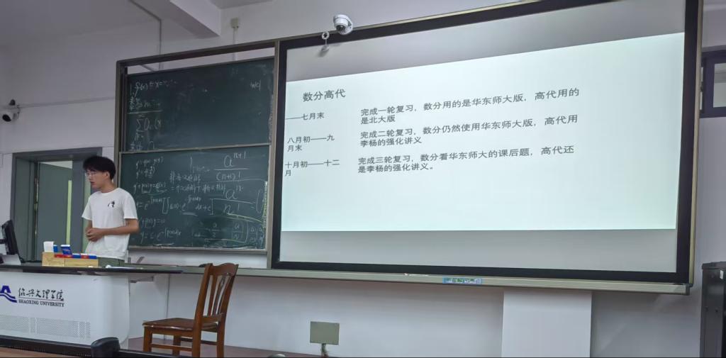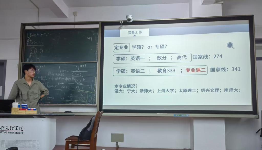 首先,数学212班、上岸浙江师范大学数学专业的王振兴学长进行分享。在备考方面,学长先是分享了自己的准备流程,每一个时间点相对应的安排,接着学长从两门专业课考试入手,要打好基础,对教材中的题目要多多练习,掌握题型,举一反三;政治方面要搭建自己的框架,关注相关的时政内容;英语方面制定相关的背诵策略,从真题入手。