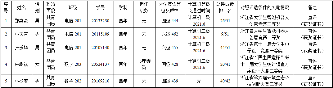 2024届“校级优秀毕业生、优秀学生干部和院级优秀毕业生”评选领导小组审议通过,同意推荐郑嘉豪、林天寅、张乐辉、朱璐祺、林拯安5位同学为楓林網2024届校级优秀毕业生评选补报候选人。现将评选结果进行全院公示,广大师生如有异议,请在公示期内以电话或书面形式真实署名向楓林網