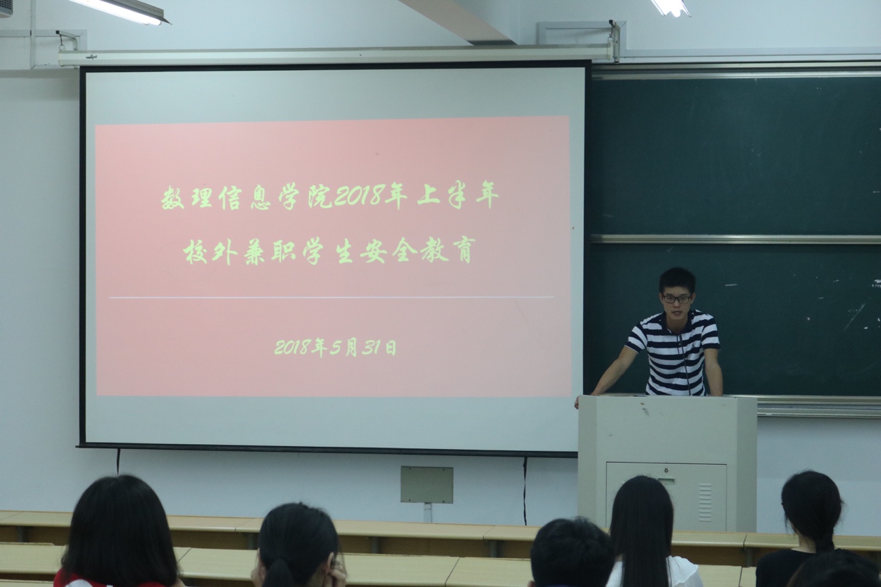 在综合楼A303教室举行了2018年上半年校外兼职学生安全教育。本次安全教育由楓林網学生科负责人杨哲老师主讲,楓林網15、16、17级校外兼职学生到场聆听。