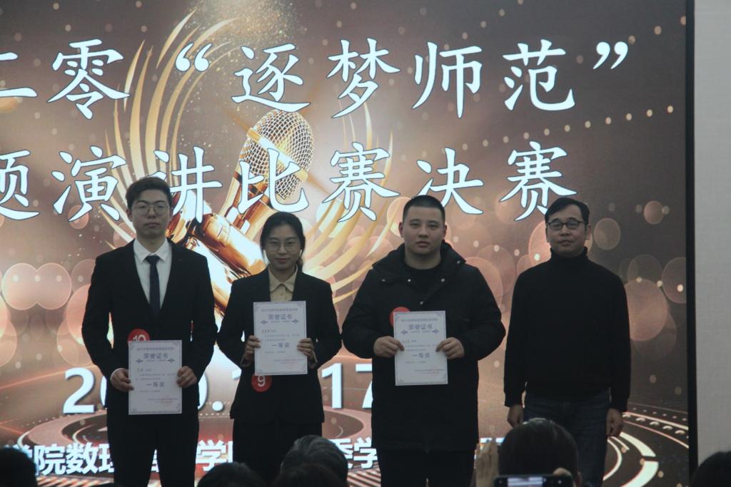 在紧张的等待之后,由主持人宣布本次比赛的获奖情况并进行颁奖仪式。获得优胜奖的是数学203班陈凯、科教191班吕杰、物理191班毛云洁、数学183班李杭珊、数学193班周一鹏、数学202班徐锦添;获得三等奖的是数学193班李紫怡、数学193班徐凯寅、数学182班林杨楠、数学181班朱笑妍、数学183班马晓君;获得二等奖的是数学181班赵丽、数学182班林颖静、数学191班应依珂、数学182班杨茹婷;获得一等奖的是数学193班裘清漪、数学181班贺渊、数学183班倪佳笛。获奖同学分别由吴培炯老师、倪仁兴老师、梁奇锋老师、方小利老师为他们颁奖并合影留念。