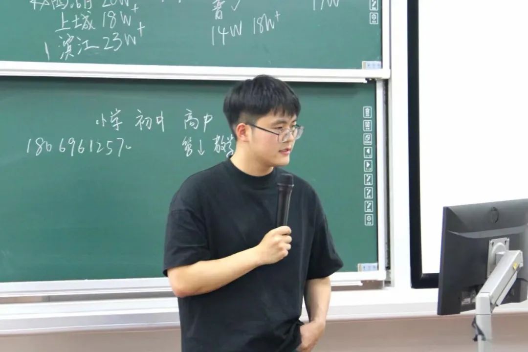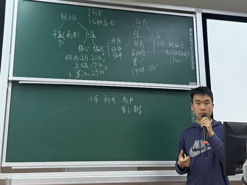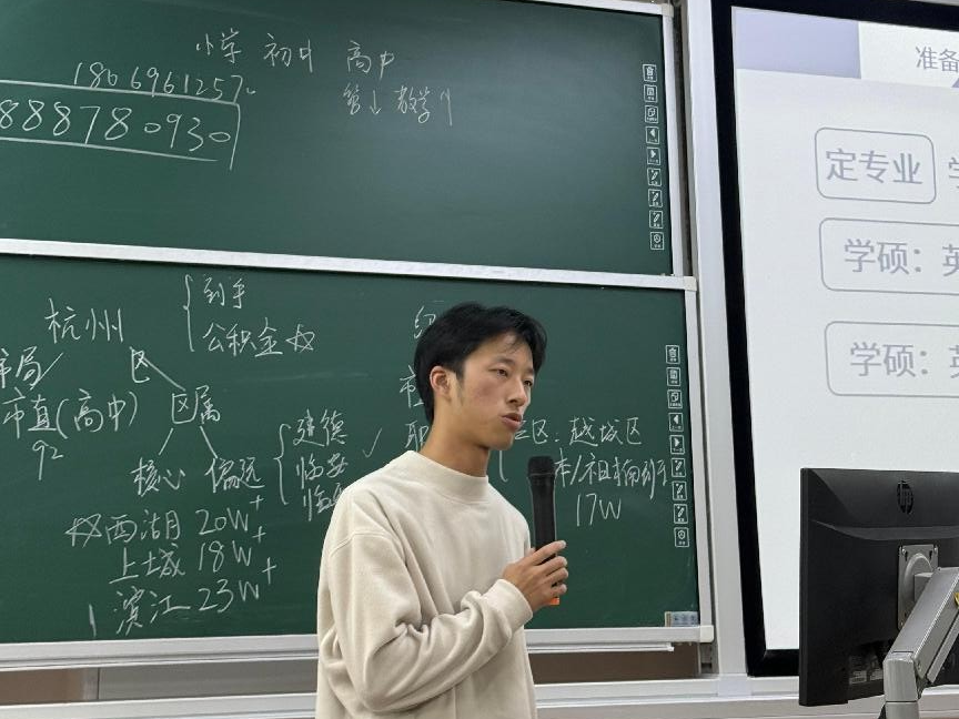 第一位主讲人是来自数学211班的陈意然学长,多次获得省政府奖学金,是祖楠班的学生之一,并在今年成功上岸。陈学长对杭州以及绍兴地区的考编考研情况非常了解,他首先给同学们分享了一些有关各地考编招生以及毕业薪酬方面的内容,之后学长还分享了考取提前批需要的条件,以及如何规划未来,选择适合自己的目标,为同学们提供参考。