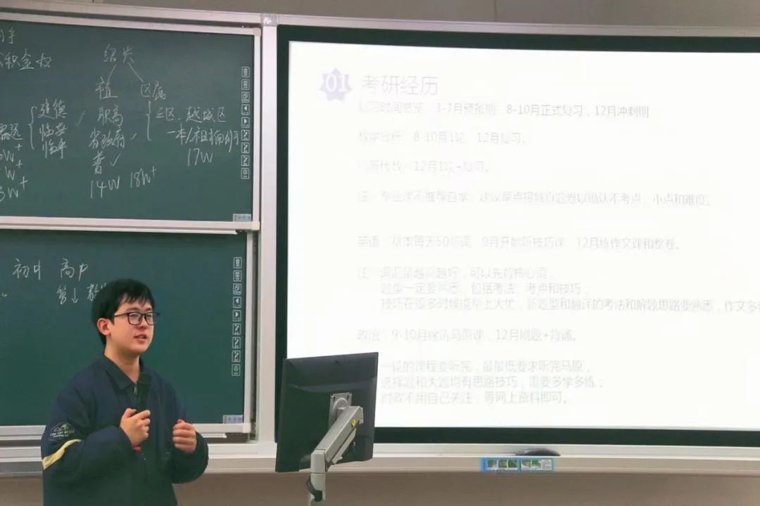 第四位主讲人来自数学211班的汤佳乐,目前已成功考上南京师范大学的研究生。学长就准备工作、英语政治准备情况以及专业课三方面给我们分享了考研心得。首先要确定考研方向及定位,了解本专业情况,并提前规划,制定合理的时间线来准备政治和英语。汤学长推荐了对政治、英语学习有帮助的辅助教学材料与app,以及分享了数学专业该如何准备专业课的心得。