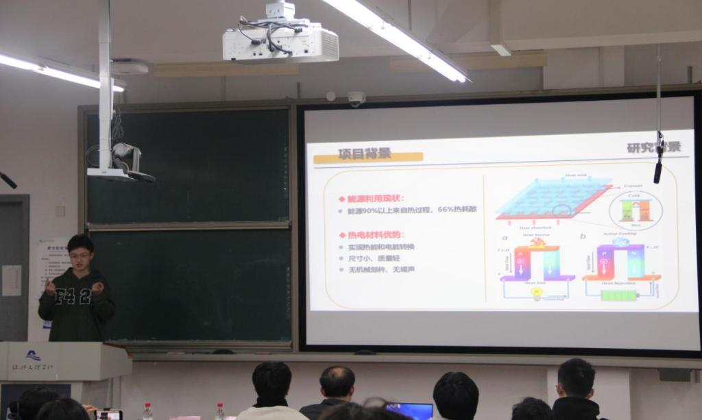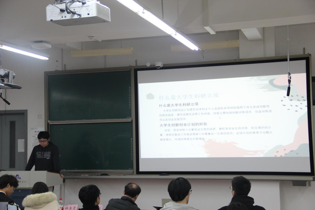 第1位分享人俞书昕,科教201班,曾获第七届全国大学生物理实验竞赛教学操作赛国家级一等奖、创新赛讲课类国家级一等奖,拥有国家级项目《基于PbTe薄膜热电器件的设计》。他首先向大家介绍了项目来源及项目简介,接着就项目组队、成员分工方面进行了介绍,最后就如何撰写项目书,如何做项目、项目进程中的注意事项给出了个人建议。