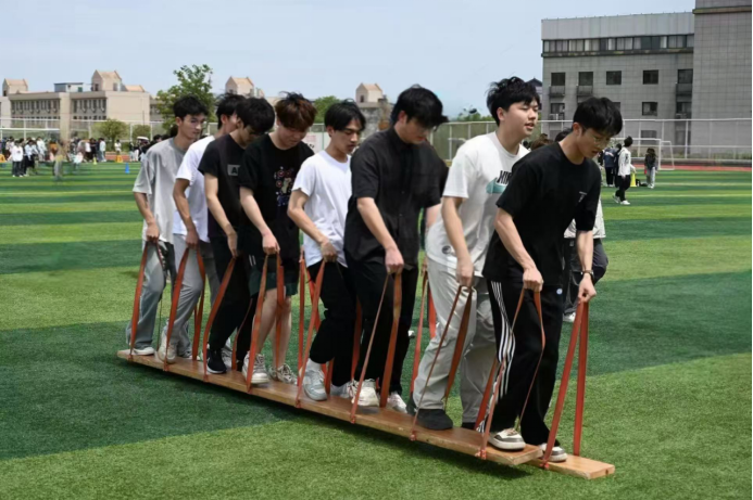 最后是十人十一足项目,也是本次运动会新加的项目。队员们用绑带相连双脚,以整齐划一的步伐诠释团队协作的力量。随着发令枪响,参赛队员们齐声高呼口号,绑在一起的双脚化作“钢铁之足”,迈着整齐有力的步伐向终点冲刺。赛场上,默契十足,从起步便展现出惊人的协调性,如离弦之箭飞速前进。场边观众的加油声浪此起彼伏,紧张氛围不断上升。十人十一足项目以独特的竞技形式,让同学们在“同频共振”中体会到团结的力量,成为校园里一道充满活力的风景线。