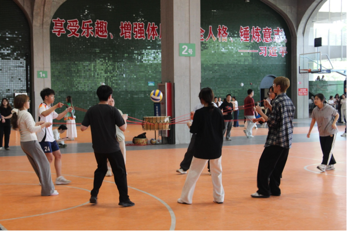 随后的是同心鼓项目。8名队员通过牵拉鼓面周边的绳索,合力颠起排球。随着倒计时开始,排球从手上落下,击打着鼓面,在鼓面上下跳动,各队屏气凝神,默契调整牵拉力度与节奏。一声声球击打鼓面的声响,是他们默契配合的证明,一双双紧盯球的眼睛,是他们专注的证明。同心鼓,鼓动人心,在同学们的完美配合之下,最终拿下第一名!在欢呼声中,我们共同感受着团队的力量与凝聚!