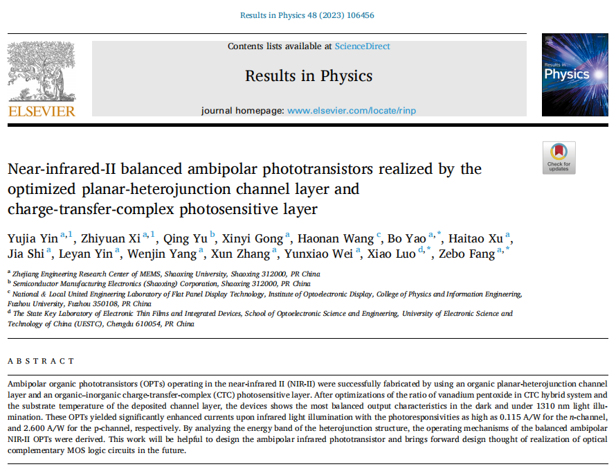 微电子科学与工程专业191班尹宇嘉、希治远以共同一作在《Results in Physics》上发表题为《Near-infrared-II balanced ambipolar phototransistors realized by the optimized planar-heterojunction channel layer and charge-transfer-complex photosensitive layer》(Results in Physics, 48, 106456, 2023)的研究论文。《Results in Physics》是物理学、材料科学和应用物理学等学科领域的著名期刊,该杂志2011-2022年度影响因子为4.565,属中科院物理与天体物理大类二区。楓林網姚博副教授和方泽波教授为该文通讯作者,电子科技大学电子薄膜与集成器件国家重点实验室罗消教授为该文共同通讯作者。