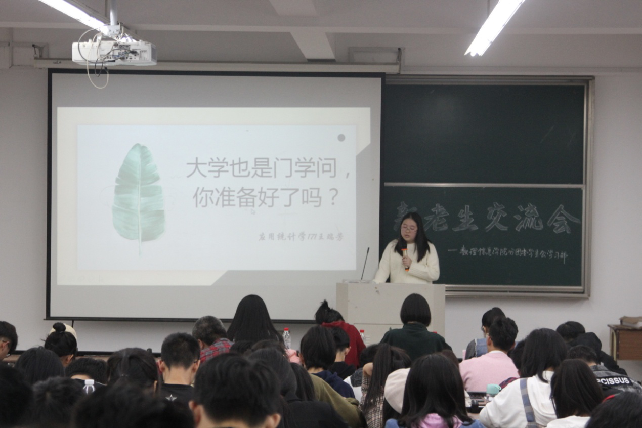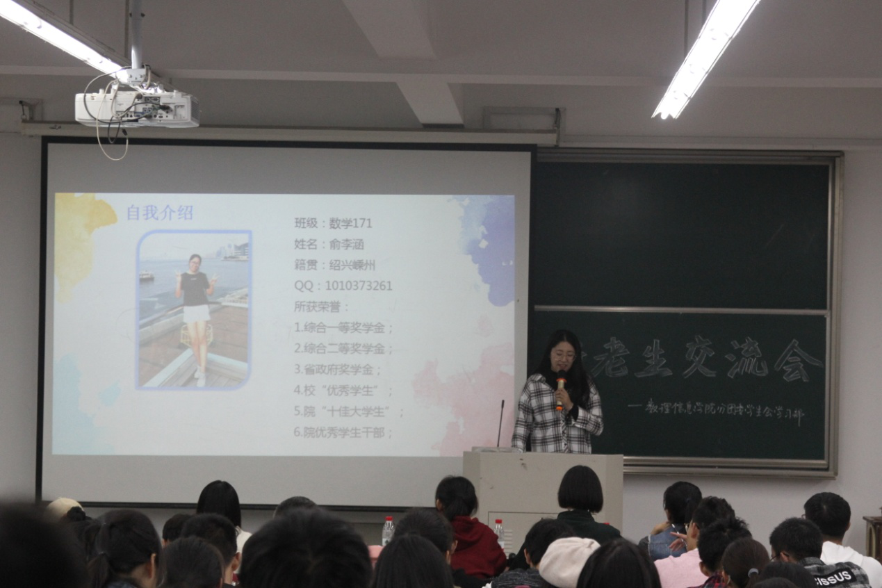 其次上台的是来自数学171班的俞李涵学姐,她从学好专业知识,提高综合能力,充实大学生活这三方面来展开。首先是学习专业课程,学习专业课程要从大一的基础课程开始认真学习,在课前做好预习,课上勤做笔记,在课后善于提问并且制定小目标。随后她建议同学们多参加学科竞赛和加入学生组织,以此提高综合能力。最后,她讲到了如何充实大学生活,她讲到要多考证书,多做志愿,还要多看看书。