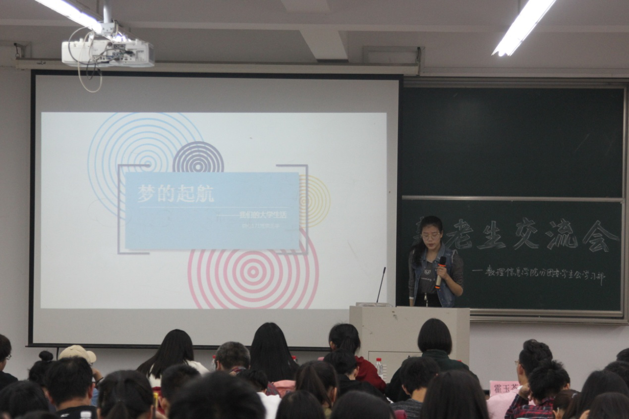 最后一位上台的是来自微电171班的霍玉苓学姐,她首先指出了大学生活之新,并从学习目的、学科认识、学习重心和态度这四个方面来说明。然后她从学习、生活和工作这三方面来分享大学经历,她指出在大学中同学们应该学怎样学习、学怎样做事、学与人相处、学怎样做人并且要制定目标。最后她对同学们提出了我能行、学会管理时间、学会主动交流的寄语。并告诉同学们要熟练的运用Word、Excel和PPT等软件。