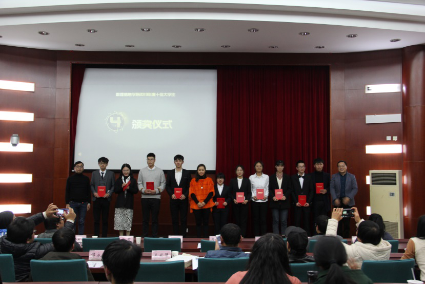 2019年度“十佳大学生”获得者,他们是:数学182班钟鹏杰、电信181班王刚、物理181班韩雪儿、电信172班楼盈颖、数学173班王慧子、物理171班诸梦瑶、微电171班姚育鹏、信计161班沈义豪、数学162班潘敏、电信162班肖剑锋。由党委书记周柳萍老师、党委副书记庞飞老师与副院长方小利老师为他们颁奖并合影留念。