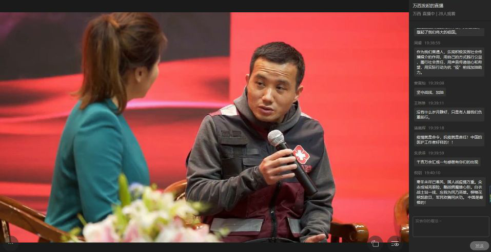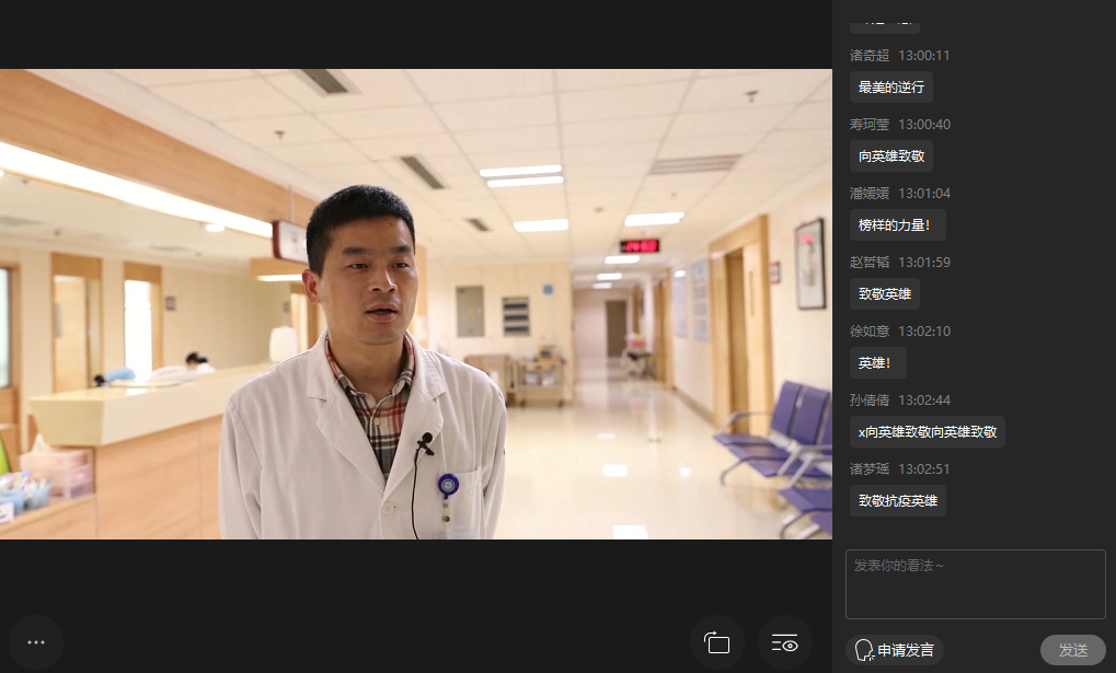 看完短片直播,感受最多的是感动、是敬重,也是喜悦。我从未想到,有一天宅在家里会是对祖国最好的贡献,也从未像现在这样真切地感受到我们不仅仅是以个人的身份生活,而是与所处的时代同呼吸,共命运。不计报酬的医务工作者们用行动向我们诠释了什么是大爱无疆。他们放弃了与家人团聚的机会,主动请缨,肩负起了身为医务工作者的责任和担当,战胜了一个又一个的困难,创造了一个又一个奇迹。这些闪烁着人性光辉、奋战在抗疫战场上的忙碌身影,汇聚成了攻无不克、战无不胜的中国力量!
